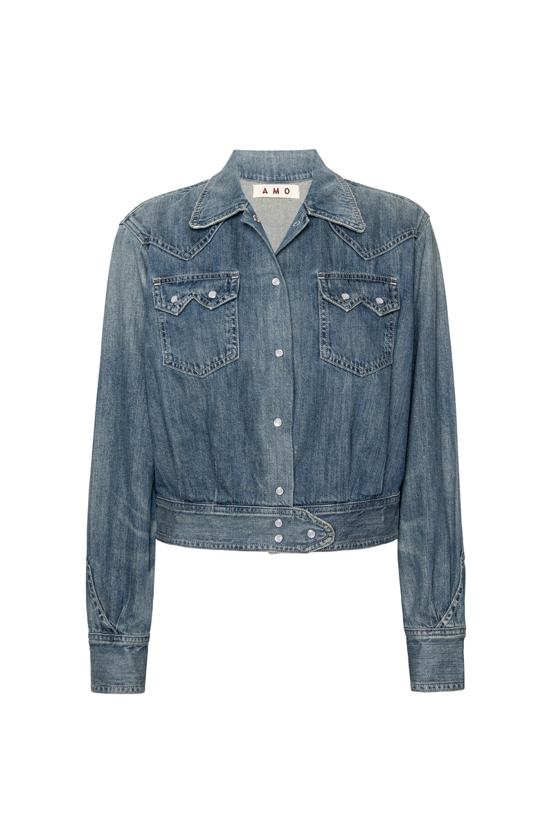 This vintage-inspired denim shirt is versatile enough to wear as a top or a jacket. Front patch pockets and pearl snap buttons add character. Adjust the buttons at the cropped waistband to create a slightly tighter fit.