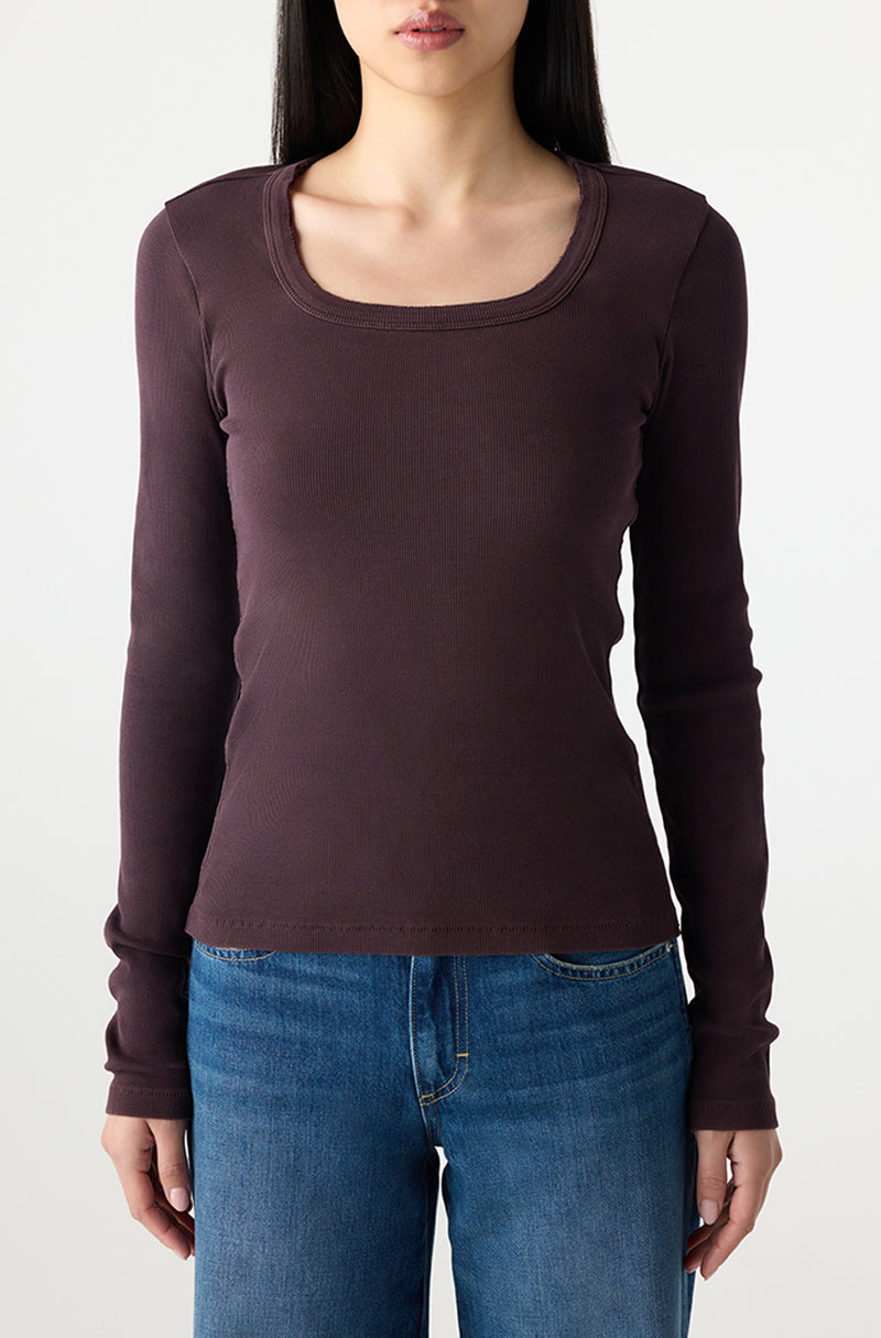 Mini rib long sleeve with a flattering scoop neck and close fit. Intentional distressing throughout.