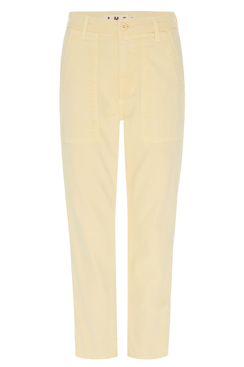 A classic army pant made modern. They feature a slightly dropped crotch and a relaxed, cropped straight leg with trouser styling. They're designed to be easy to wear and effortless to style. The utilitarian front and back patch-style pockets and raw cut hem adds a touch of edginess. Zip fly. This style is garment dyed, which adds a dimension of color, giving new pieces the feel of vintage.