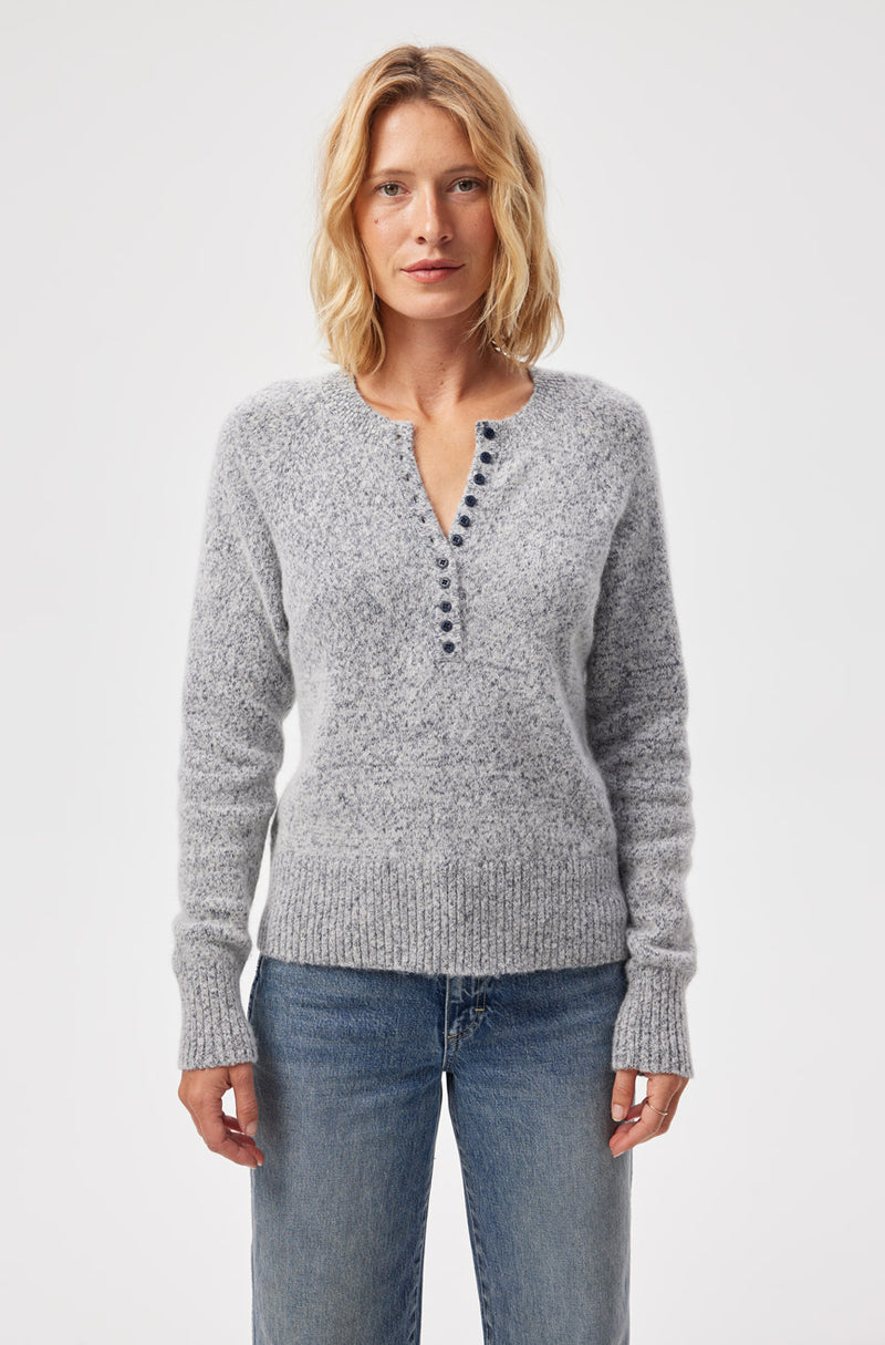 With a mid-length and a raglan shoulder, this lightweight henley sweater has an elevated yet relaxed aesthetic. The classic henley neck, with small button details along the front placket, adds a timeless touch. Ribbed hem and cuffs complete the look.