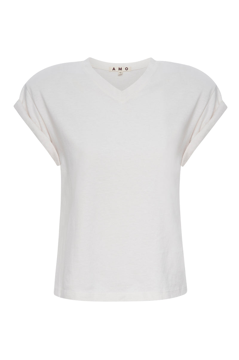 Featuring a high V-neckline, slim shoulder pads and a relaxed fit that can be tucked in or out to accommodate any look, this tee pairs well with denim and beyond. Remember it on those days when you just don't know what to wear.