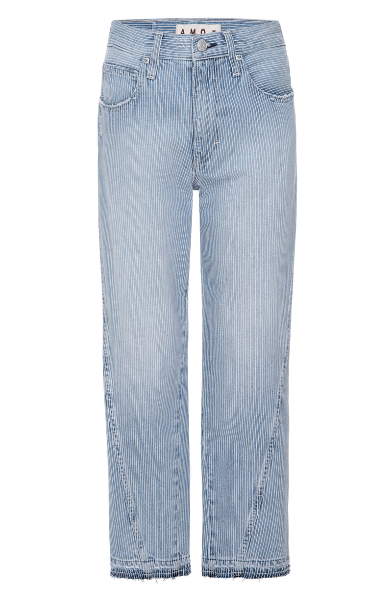 A mid rise, loose fit, horseshoe style jean that offers a modern twist on the classic railroad stripe look. Designed to be full in the leg with a curved outseam, cropped ankle, and let down hem, they give off a vintage-inspired vibe.