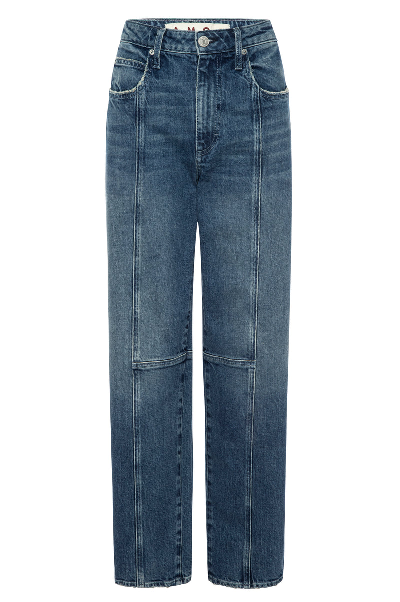 This pair of high rise jeans in comfort stretch denim is your new everyday go-to. With an easy fit through the hip, seat, and thigh, they balance laid back comfort with chic utilitarian style. Seamed details at the front and knee, plus a subtly curved outseam, add a modern edge, while the versatile faded blue wash makes them endlessly wearable. Slightly cropped. Zip fly.